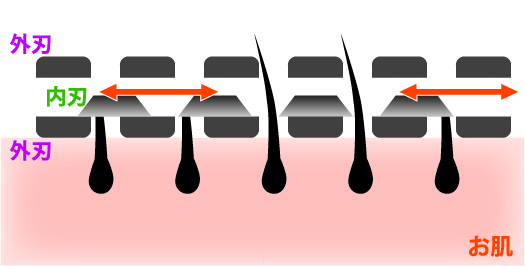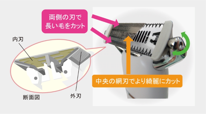 V字形状の外刃が上下で内刃をはさんでいるので、毛を起こしてスムーズにカット。
